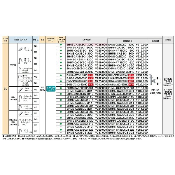 ■ わきあげ温度や給水温度により、機器からの出湯温度は約33℃〜43℃(ちょう℃いいダイヤルで温度を下げた場合は約21℃?31℃)になる場合があります(機器から水栓までの配管長さや気温の影響により、水栓からの吐水温度はさらに変化する場合があります)。