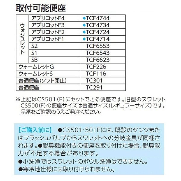 ●CS501・501Fには、既設のタンクまたはフラッシュバルブからスワレットへの分岐金具が同梱されます。