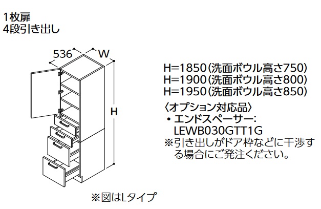 TOTO トールキャビネット 【LTSWB025BN R/L 1 W/P/B/J/C/M】 サクア 1枚扉4段引き出し 間口250 洗面ボウル高さ800 受注生産品 ♪§