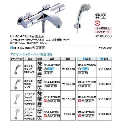INAX/LIXIL BF-A147TSL サーモスタット付シャワーバス水栓 アウゼ 吐水口固定式 エコアクアスプレーシャワー(めっき仕様) 逆止弁付 一般地用 [★]