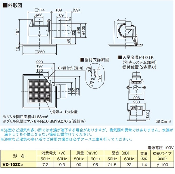 【在庫あり】三菱 VD-10ZC13 換気扇 浴室 トイレ 洗面所 (居間 事務所 店舗) 用 ダクト用換気扇 天井埋込形 サニタリー用 低騒音形 (VD-10ZC12の後継品) [♭☆2]