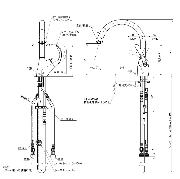 ※水栓取り付け面から上方350mmより低い位置に棚や物があると取り付けられません。ご注意ください。