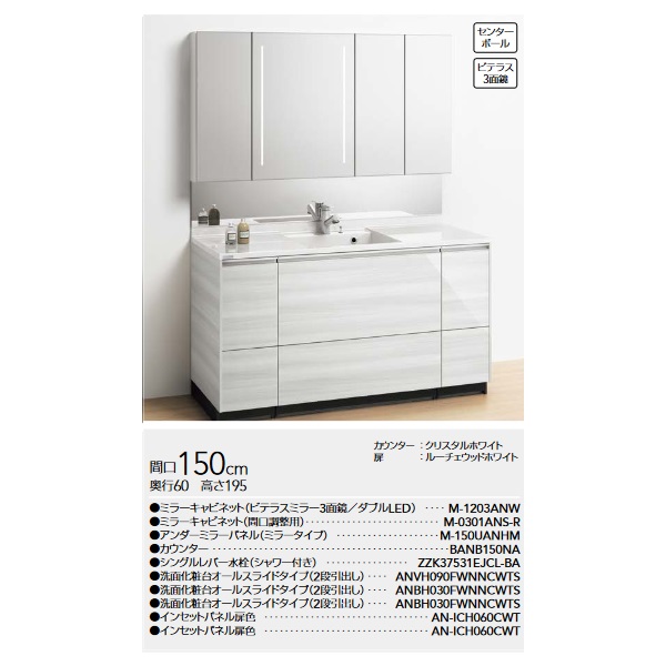 クリナップ [ミラーキャビネット (3面鏡)M-1203ANW + カウンター BANB150NA ] 間口150cm ティアリス 扉/ルーチェウッドホワイト 受注生産品§♪ [tiaris-2024-set5]