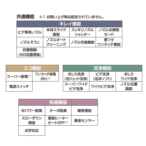 スローダウン便座・Wパワー脱臭・ターボ脱臭・おしり洗浄・ビデ洗浄・暖房便座・キレイ便座・鉢内スプレー