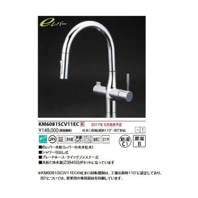 ※KM6081(SC)V11ECの吐水口回転規制は、工場出荷時110°に設定しており、80°については、変更用の専用部材を同梱しています。